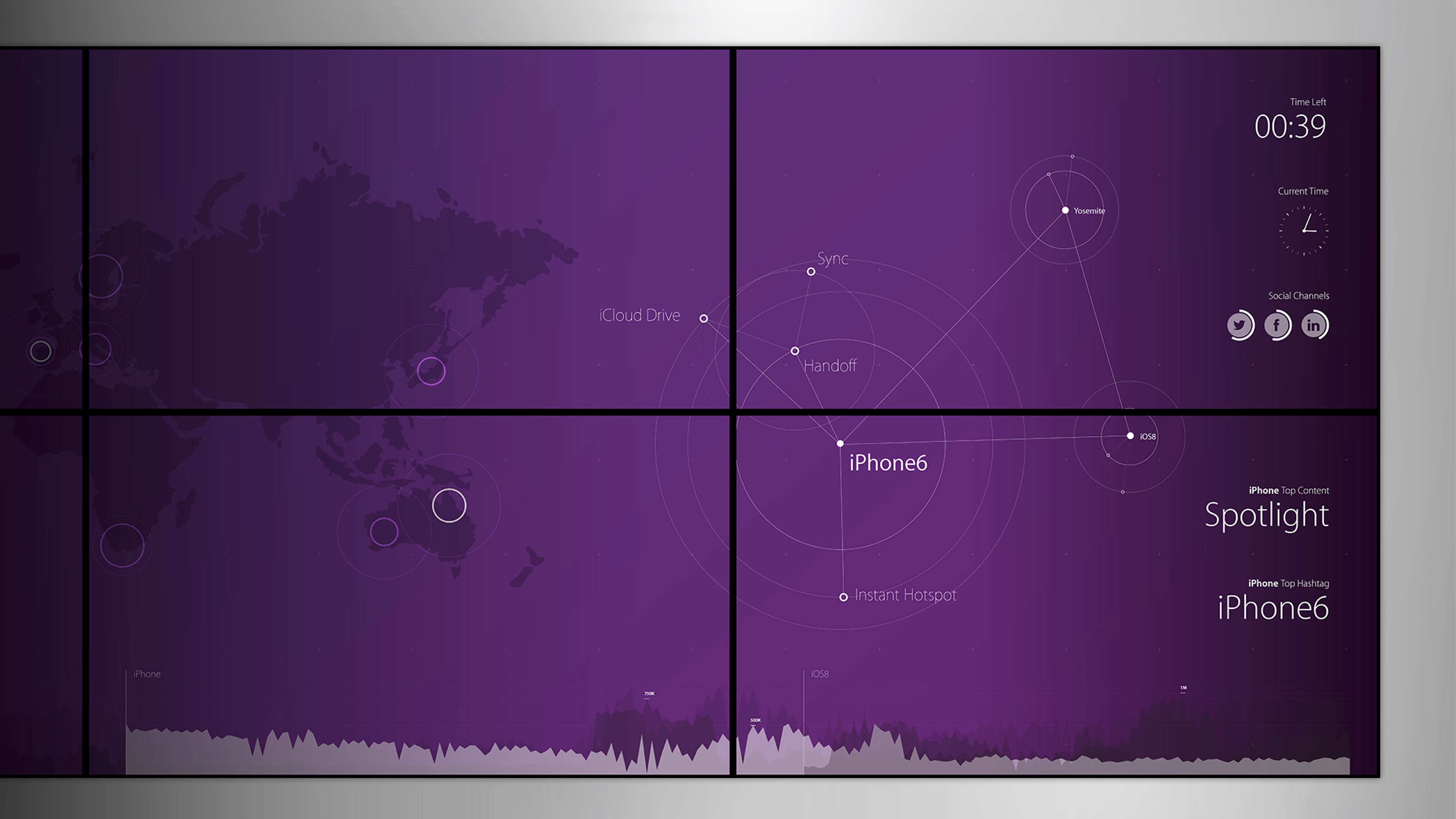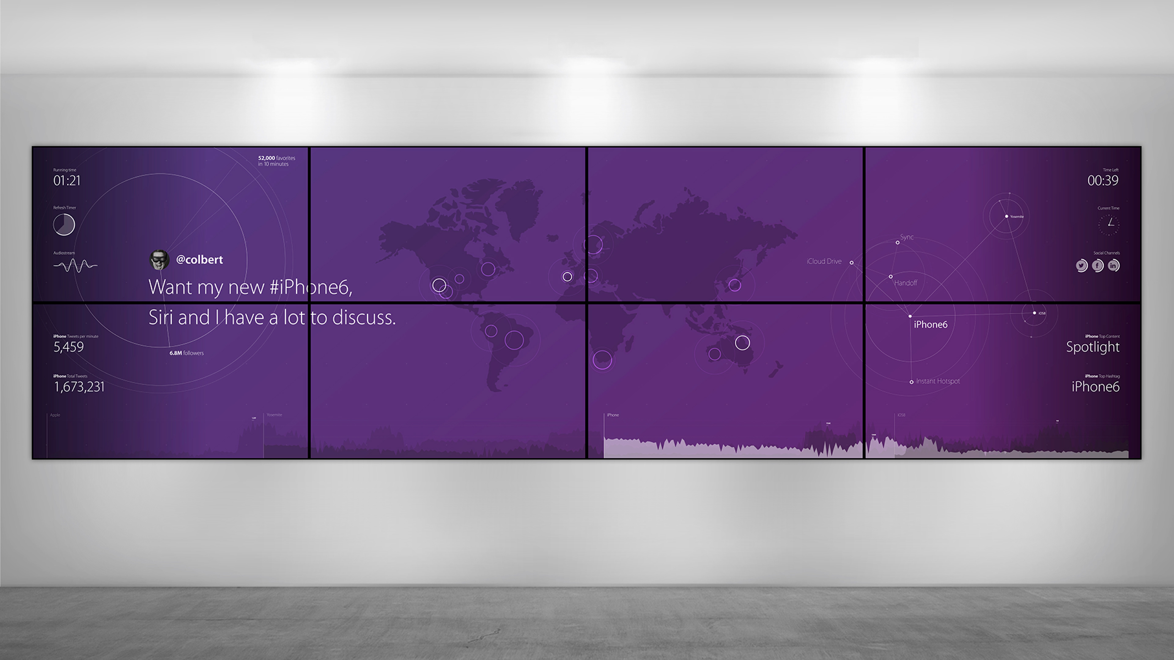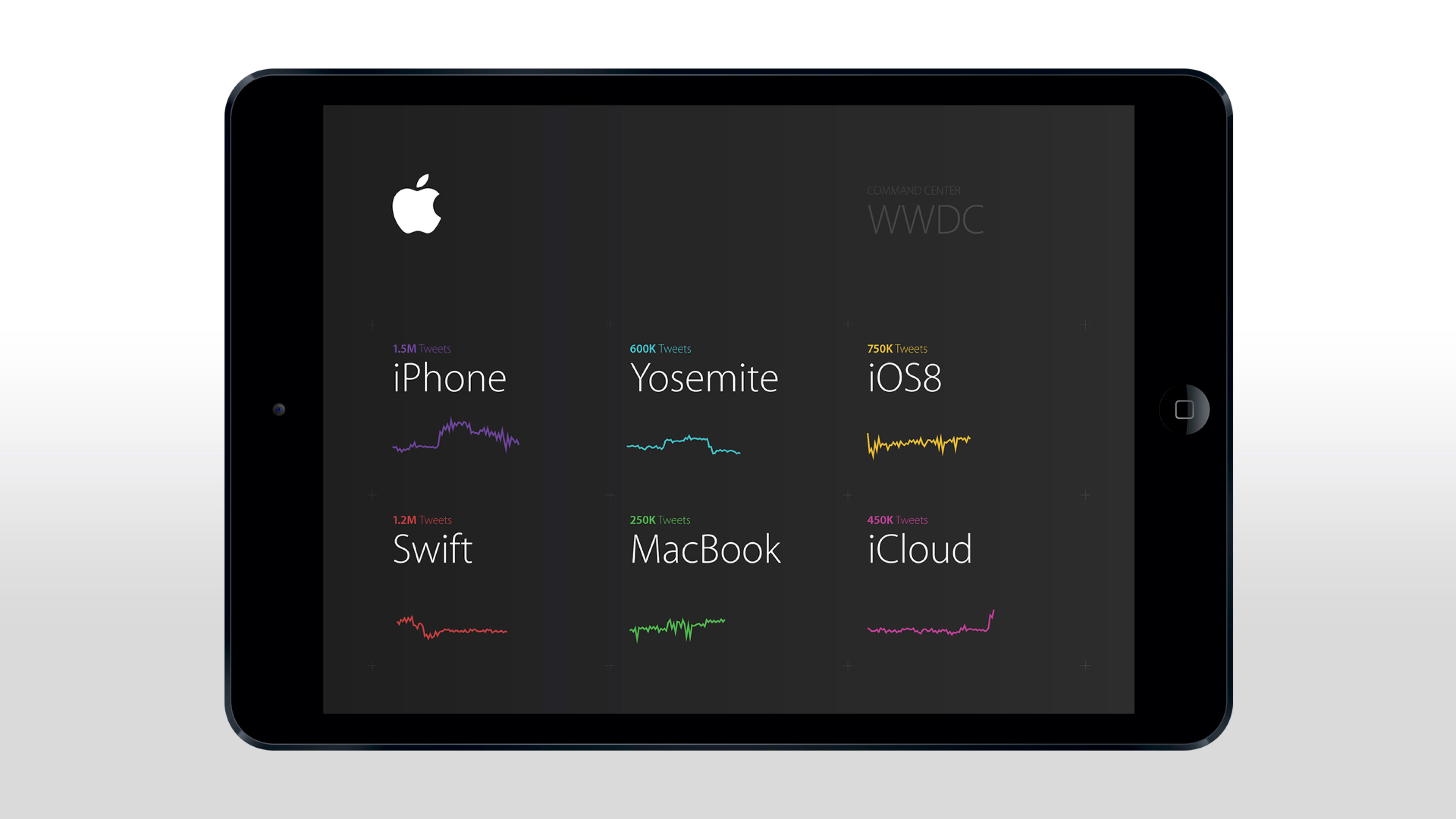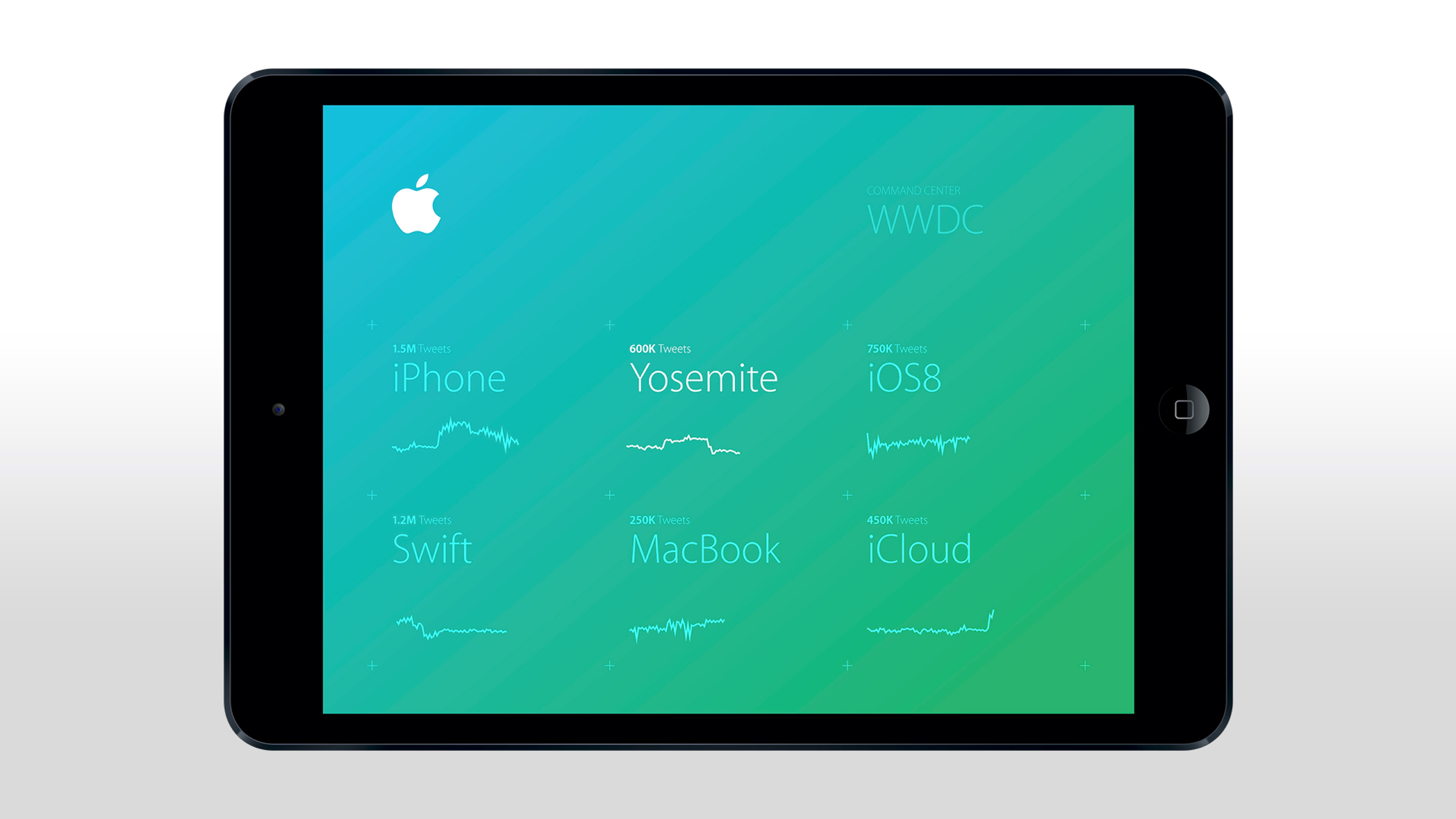 Two of my first big projects at Apple were building Apple Live which was a live editorial stream to accompany Keynote and a social command center for Keynote. For keynote we wanted to understand what consumers were saying when a new product was announce during keynote. We also wanted to uncover the themes of consumer opinion and drivers of sentiment from global social media sources. In the past command centers lacked great design experiences so I wanted to reimagine a new approach. I also wanted to control the experience with an iPad or iPhone.