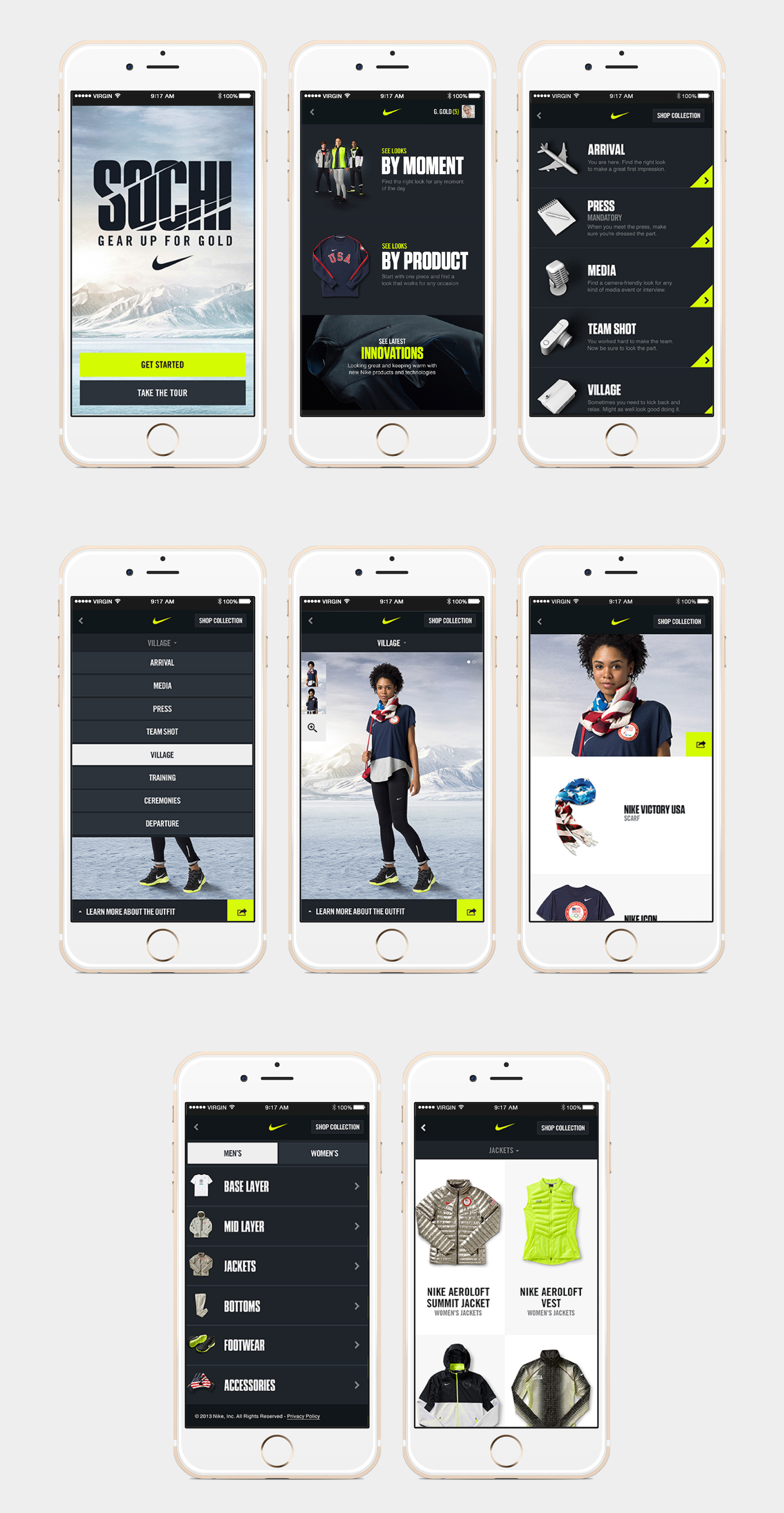 The Sochi Winter Games Experience consisted of an athlete and consumer lookbook, Sochi digital storefront and social editorial experience. For the athlete experience we created a simple app that would educate the athletes on what outfits to wear for each event from interviews to podium. We used the same app to give consumers a look into the athlete’s wardrobe but also making key styles commerce enabled.